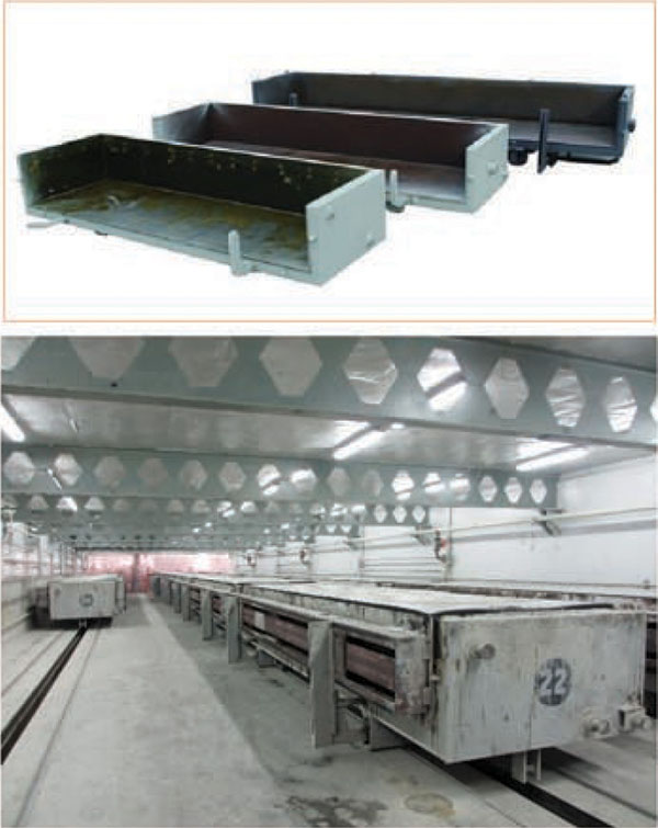 模具是承載澆注坯體的專用器具。料漿自澆注攪拌機內注入到模具中,經發(fā)酵護養(yǎng),脫去模框,即成待切割的坯體。